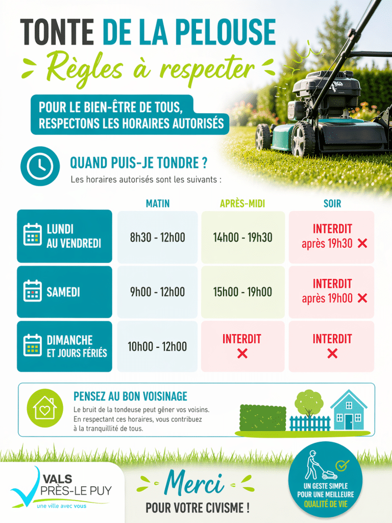 La tonte et l’entretien des espaces verts personnels, ne doivent pas être réalisées en dehors des horaires autorisés : du lundi au vendredi de 8h30 à 12h00 et de 14h à 19h30, le samedi 9h à 12h et de 15h à 19h, et le dimanche et jours fériés de 10h à 12h.