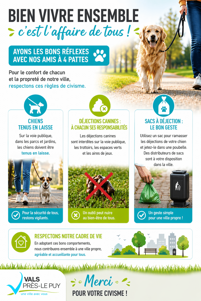 🐶 Si vos amis les animaux font leurs besoins, merci de procéder au ramassage avec les sacs de déjections disponibles à cet effet.